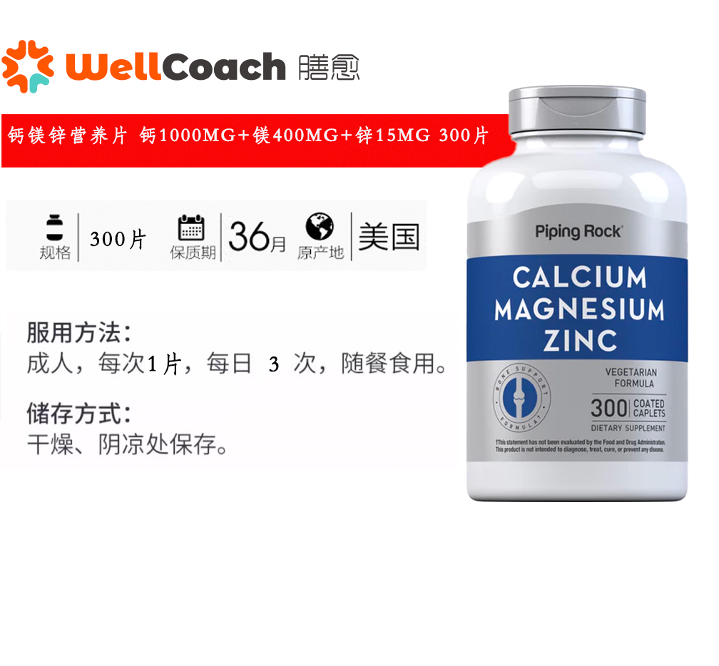 【美国直邮】钙镁锌营养片 钙1000mg+镁400mg+锌15mg 300片