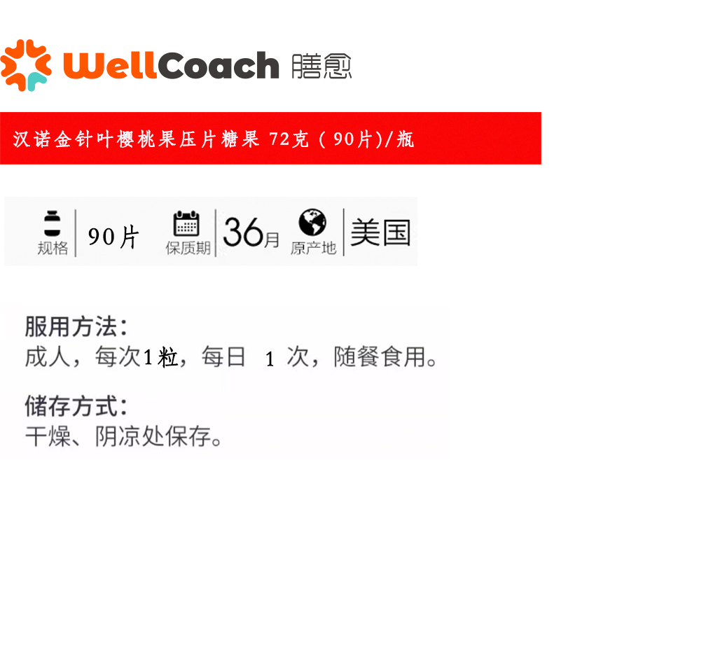 【2月13日起放假】汉诺金针叶樱桃果压片糖果 72克 ( 90片)/瓶