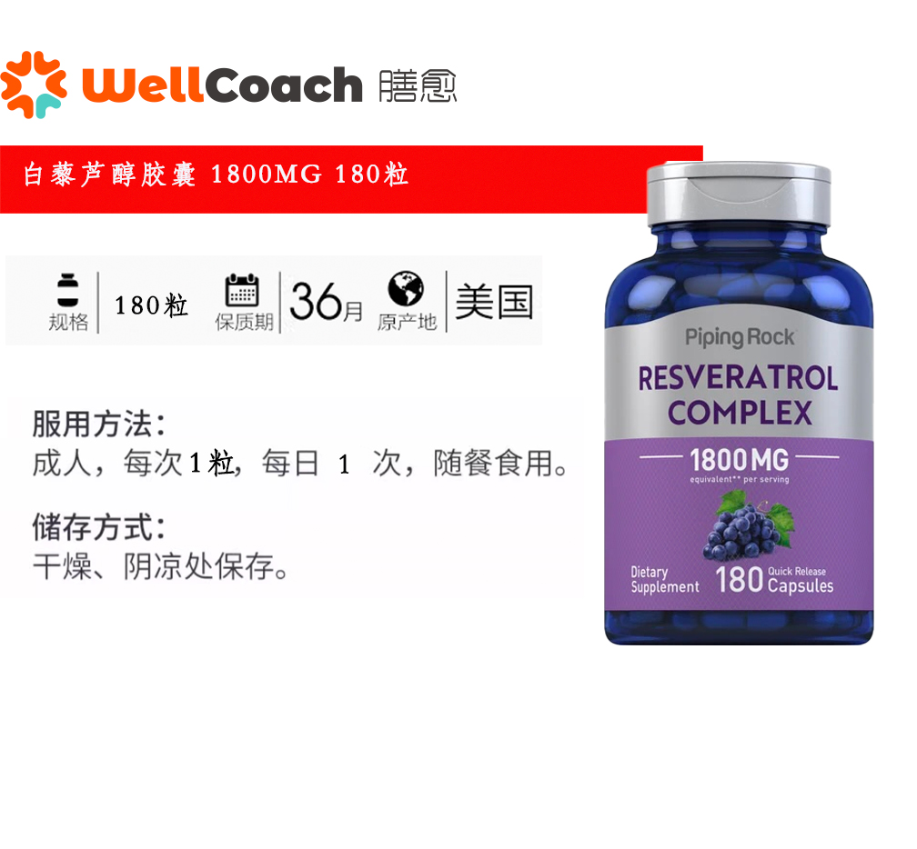 【美国直邮】白藜芦醇胶囊 1800mg 180粒