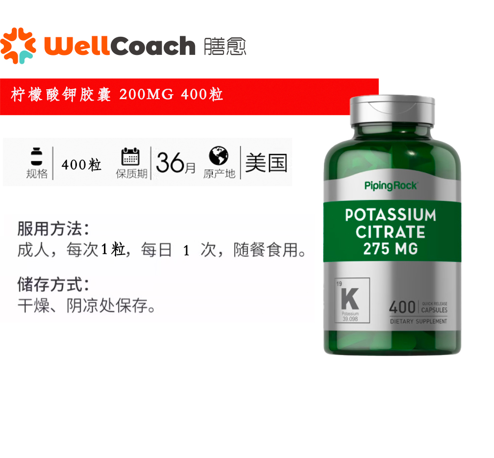【美国直邮】PiPingRock 柠檬酸钾胶囊 200MG 400粒
